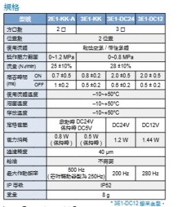 3E1-DC12(3 通 DC12V 标准型):属于 3 口 3 通常闭结构,操作压力 0~0.8MPa,标称流量 28±10% Nl/min;开阀应答时间 2.0±0.5ms,关阀 0.5±0.2ms,采用恒定 DC12V 供电,恒定功耗 1.44W,最大动作频率 200Hz,专为低压控制系统设计,多为接单生产的定制化规格,无常规库存。