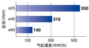 ø40mm 缸径:气缸最大运行速度为310mm/s,条形长度略超过横轴 300mm/s 的刻度线。