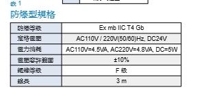 防爆等级为Ex mb IIC T4 Gb,额定电压支持AC110V/220V(50/60Hz)、DC24V,功耗分别为 AC110V=4.5VA、AC220V=4.8VA、DC=5W,电压容许范围 ±10%,绝缘等级 F 级,标配导线长度 3m。