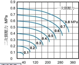 蓝色曲线:每一条曲线对应一个固定的一次侧压力(电磁阀进气口的输入压力),从 0.1MPa 到 0.8MPa,和规格书里该阀 0.15~0.8MPa 的使用压力范围完全匹配,最上方曲线为 0.8MPa 进气,最下方为 0.1MPa 进气。